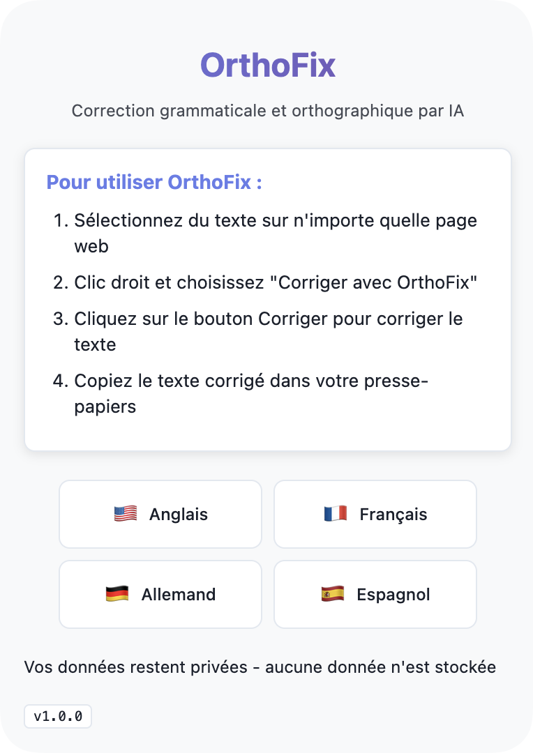 Vos textes sont chiffrés en transit et ne sont jamais stockés sur nos serveurs ; ils sont traités de façon éphémère puis supprimés. OrthoFix est conforme au RGPD et ne revend ni n’analyse vos contenus à des fins publicitaires.